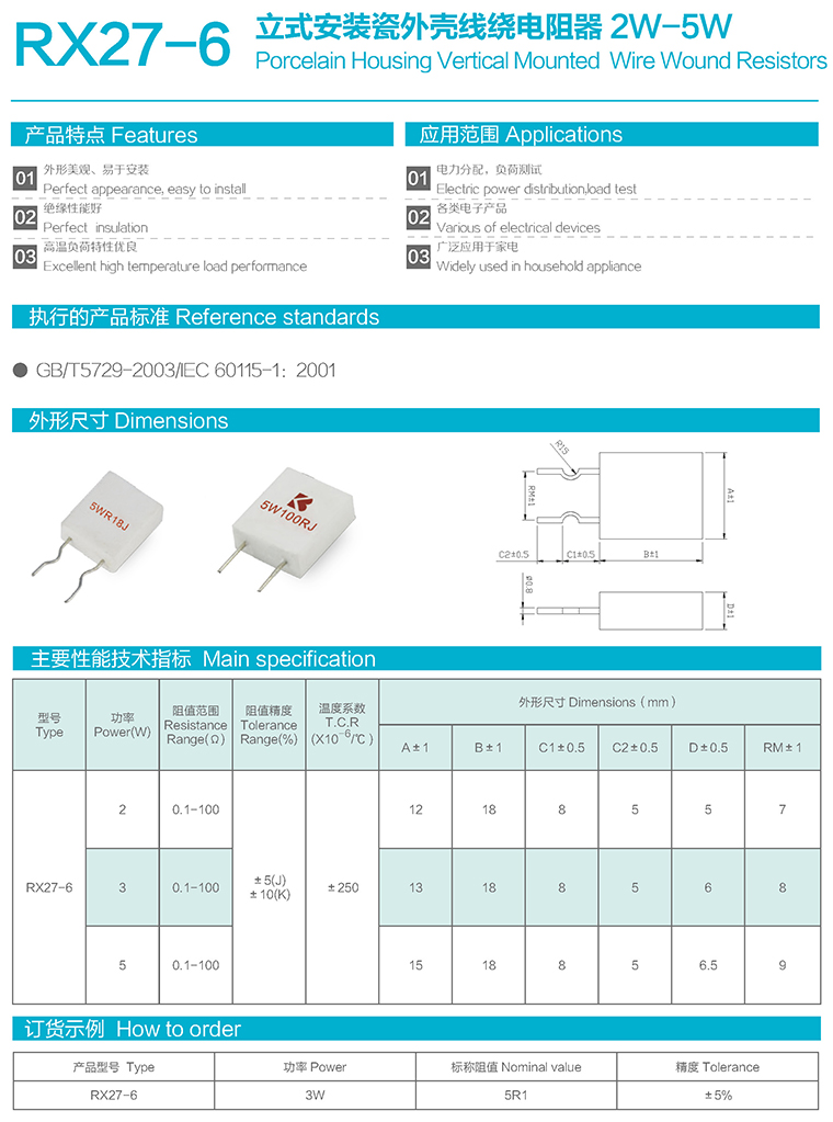 RX27-6型立式安装瓷外壳线绕电阻器